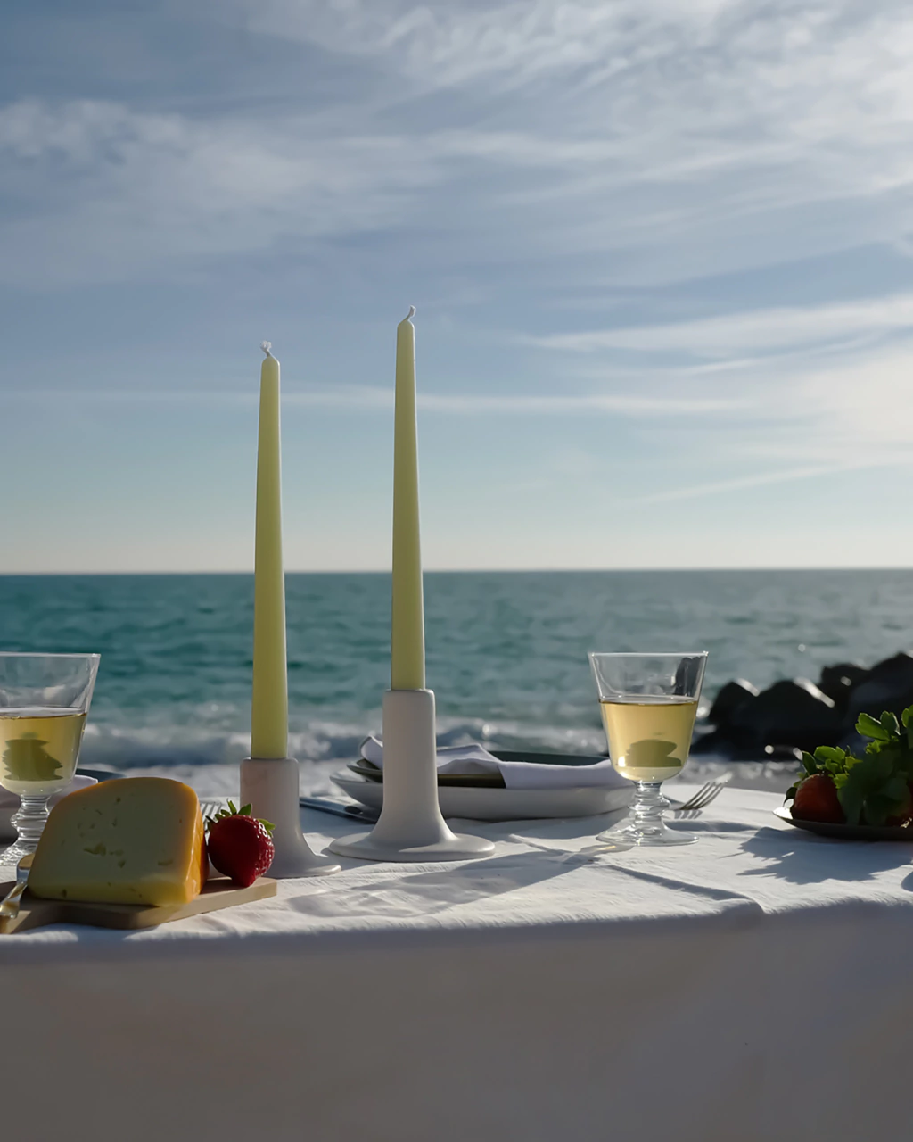 El verano eterno capturado en ésta edición especial y limitada con las velas para candelabro Cala Aguamarina, 100% de Pura Cera de Abejas, filtrada naturalmente. Un corazón de pura cera de abejas del tono nás claros posiblesy un baño externo de cera de abeja y tinte natural Índigo logran ésta tonalidad clara, fresca y alegre y totalmente natural.